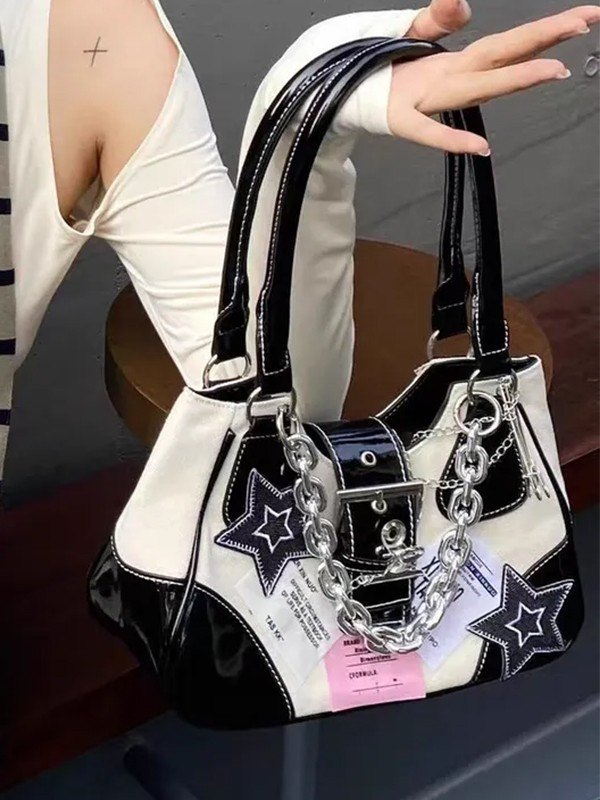 Bolso de hombro con hebilla y patchwork adornado con cadena de estrellas