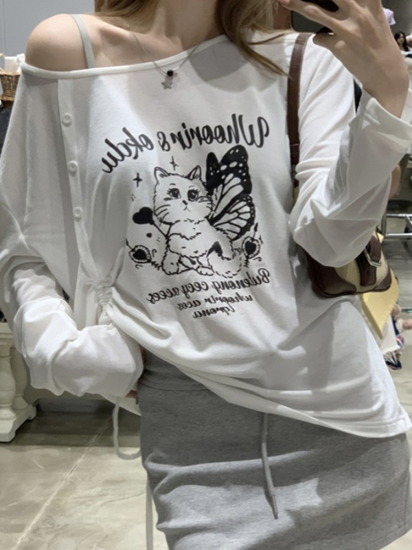 Camiseta de manga larga holgada con hombros descubiertos y estampado de gato