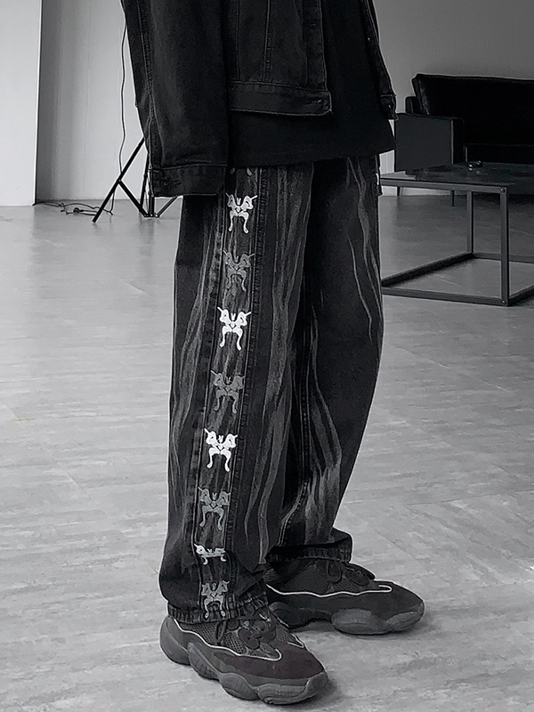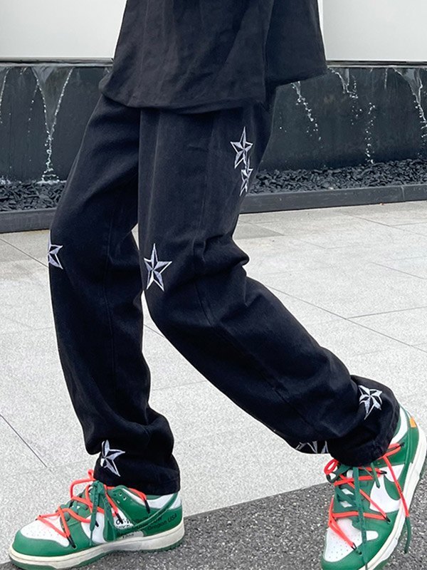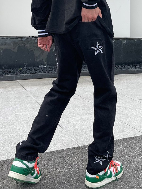Descripción: Estos jeans oscuros de inspiración retro para hombre tienen un corte favorecedor , tienen detalles de estrellas bordadas en contraste a lo largo de la pierna, cuentan con múltiples bolsillos de jeans y terminan con una bragueta con cremallera y botón.