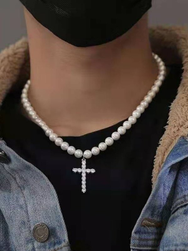 Collar de perlas de imitación con colgante de cruz de diamantes de imitación para hombre