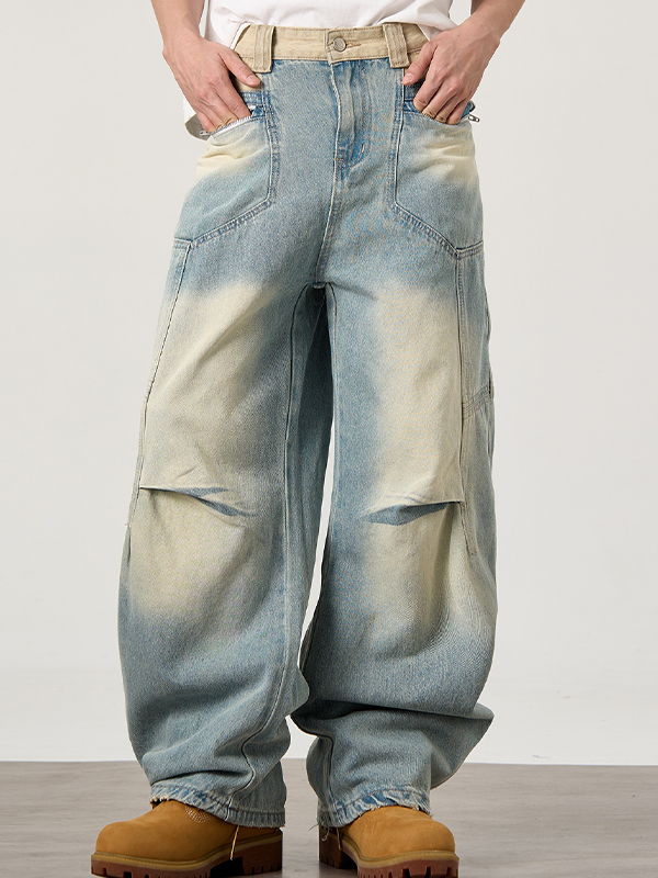 Jeans de trabajo con múltiples bolsillos, lavados y desgastados, estilo retro