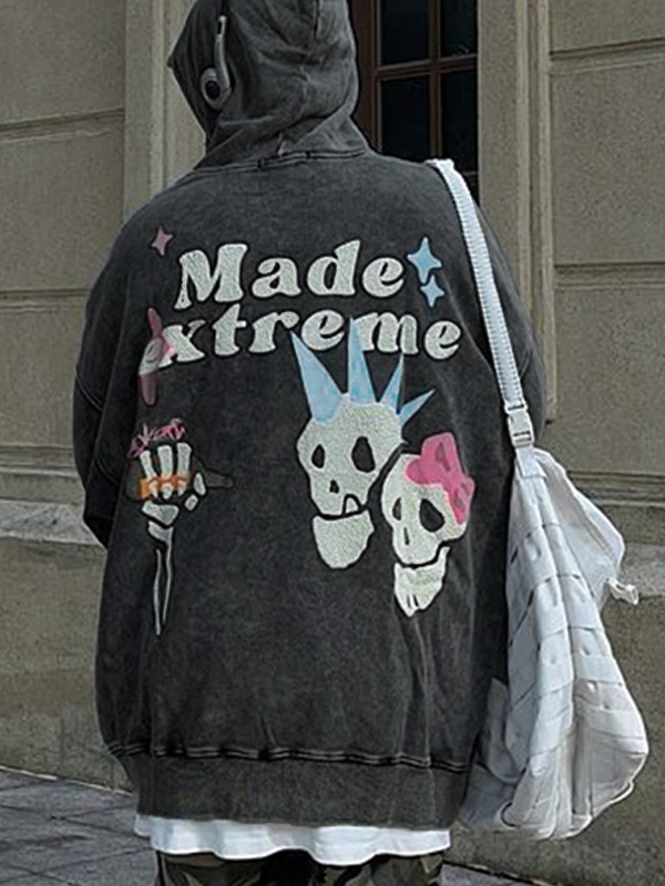 Sudadera con capucha extragrande con estampado de calavera desgastada Hip Pop para hombre