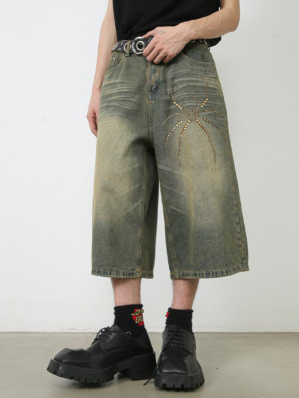 Pantalones cortos de mezclilla casuales sueltos con diamantes de imitación de araña para hombre